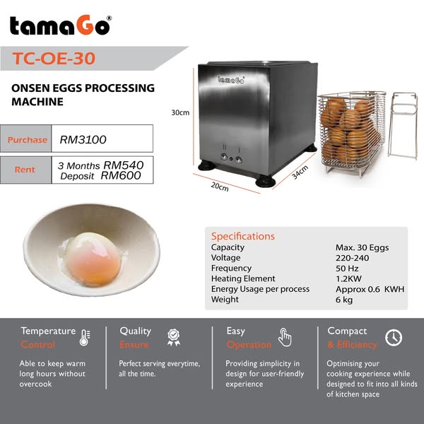 搜索关键词 commercial egg cooker, egg processing equipment, half boiled egg machine, restaurant kitchen equipment, hotel egg processing, automated egg cooking, TamaGo machine, Malaysian kitchen equipment, oriental kopi, village park restaurant优势 Automates egg processing,Guarantees consistent egg quality,Increases productivity,Easy to use interface,Reduces labor costs,Provides hassle-free maintenance