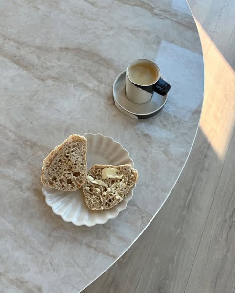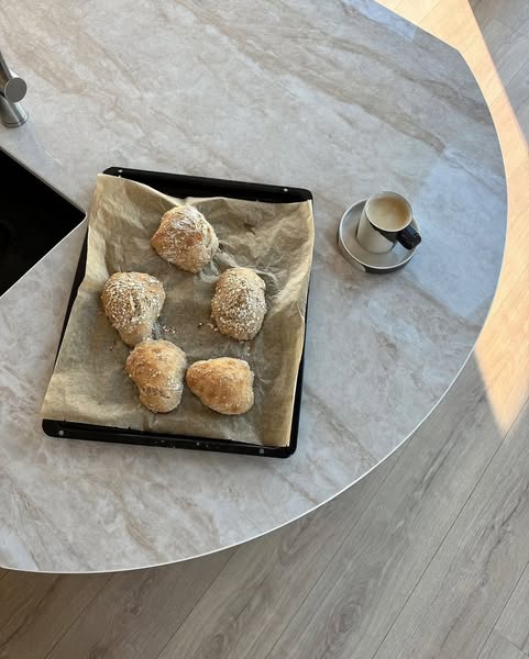Discover the elegance and functionality of Dekton Arga in this contemporary kitchen. The central island features a light-colored countertop with subtle veining, enhancing the sophisticated and clean design. The integrated black sink and modern faucet add a touch of style and practicality. With Dekton Arga, every detail counts: from the tray with freshly baked buns and a cup of coffee to the vase with fresh flowers that add a cozy touch. Natural light flows through the large windows, creating a bright and welcoming atmosphere that makes every moment in the kitchen an unforgettable experience.