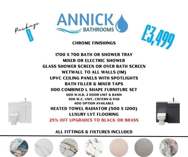 搜索关键词 bathroom renovation, bathroom design, bathroom remodel, Annick Bathrooms, discount bathroom, luxury bathroom, bathroom installation, fitted bathroom, Irvine bathroom, bathroom showroom优势 £100 discount,Complete bathroom renovation package,Wide range of products to choose from,Luxury LVT Flooring Included,5* Google Reviews,12 Month Warranty