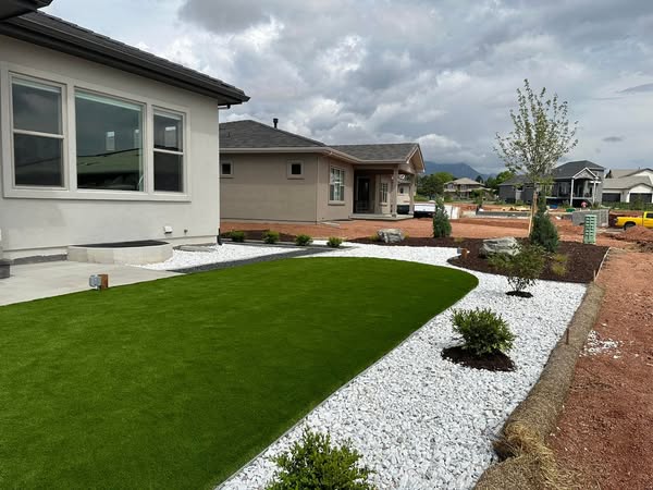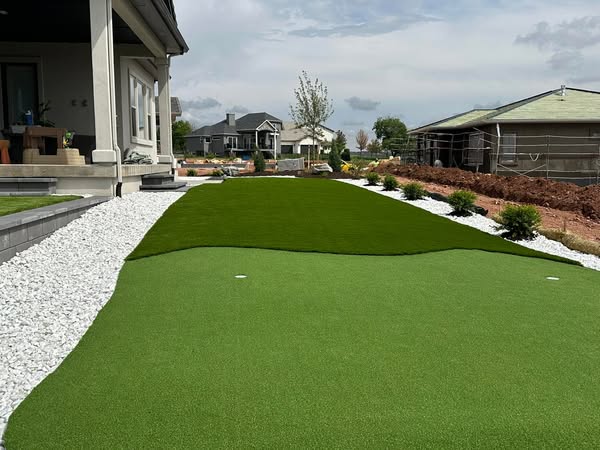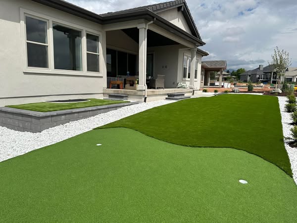 Imagine lounging on your plush green lawn, practicing your golf swing on your very own putting green, or entertaining guests on your stylish patio. With this backyard, the possibilities for outdoor living are endless!