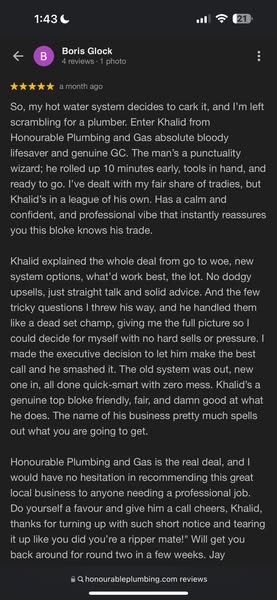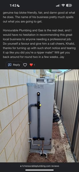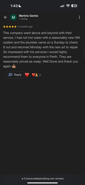 At Honourable Plumbing and Gas, we take pride in delivering top-quality work with integrity you can count on.