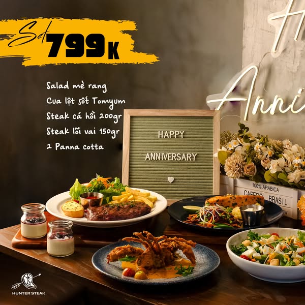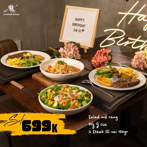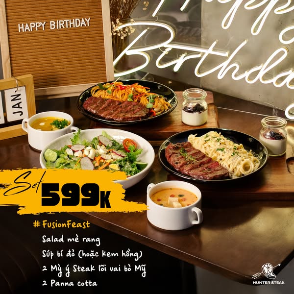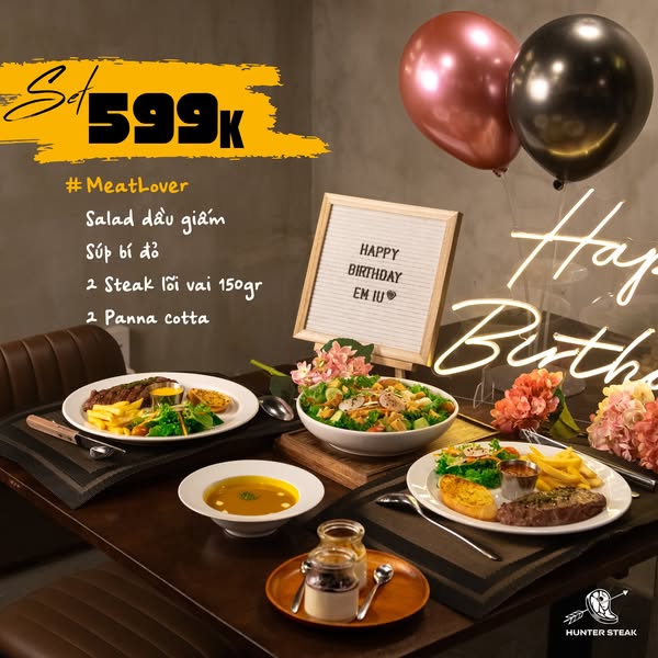 搜索关键词 birthday party, steak restaurant, Ho Chi Minh City, free decoration, Asian European cuisine, cozy dining, Hunter Steak, special offers, restaurant promotion, Vietnamese restaurant优势 Free birthday decorations,Affordable pricing (from 599k),Variety of set menus (Asian-European fusion),Cozy and inviting atmosphere