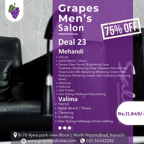 搜索关键词 men's salon karachi, groom package deals, wedding grooming services, grapes men salon, haircut and beard, nikah groom package, shaddi groom package, valima groom packages, karachi hair salons, men's spa deals优势 75% Discount,Premium Grooming Services,Specialized Wedding Packages