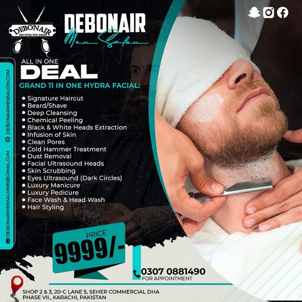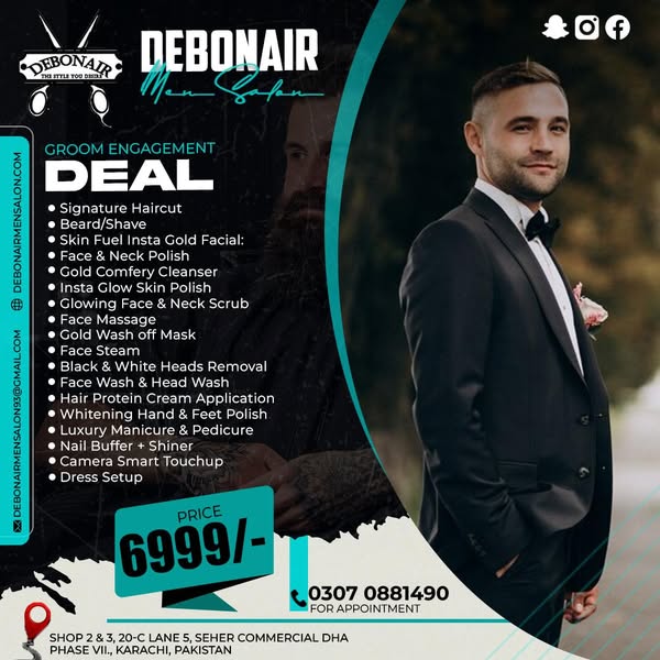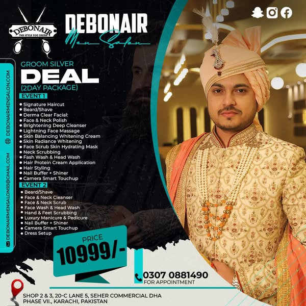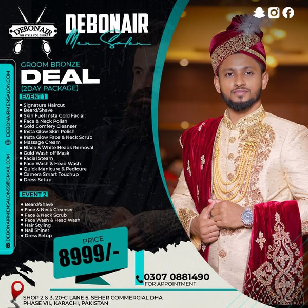 搜索关键词 wedding grooming package, valima grooming, men's salon Karachi, barber shop DHA, 3 day grooming, premium grooming service, groom like boss, karachi grooms, wedding barber, debonair men's salon优势 Specialized grooming for wedding events,Multiple packages to choose from (Silver, Gold, Platinum),Convenient 3-day packages,Offers both Valima and Wedding Packages