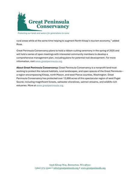 搜索关键词 land conservation, open space, community benefit, Kitsap County, nature preservation, timberlands legacy, Great Peninsula Conservancy, environmental donation, String of Pearls trail, collaborative conservation优势 Preserves 5,000 acres of former timberlands.,Creates a legacy system of open space.,Benefits the community forever.,Showcases collaboration between multiple organizations.
