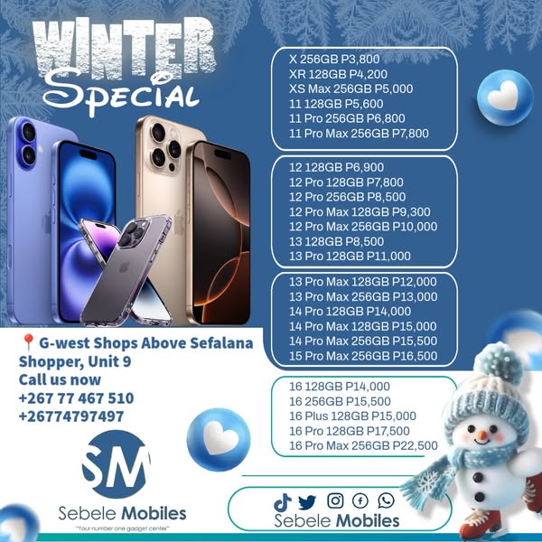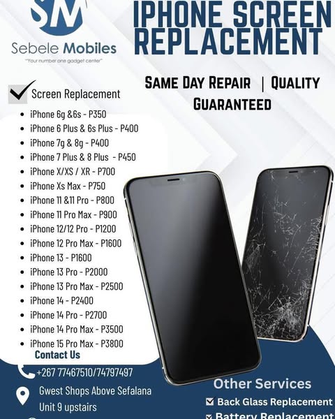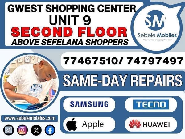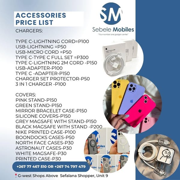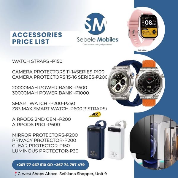 搜索关键词 Sebele Mobiles, Phone Deals, iPhone Repair, Samsung Repair, Mobile Accessories, Botswana, Same Day Repair, Affordable Phones, Online Shopping, Gwest Mall优势 Unbeatable prices on phones and accessories,Same-day repair service,3-month laybye option,24/7 online shopping,Convenient location in Gwest Mall,Trusted, fast, and affordable services