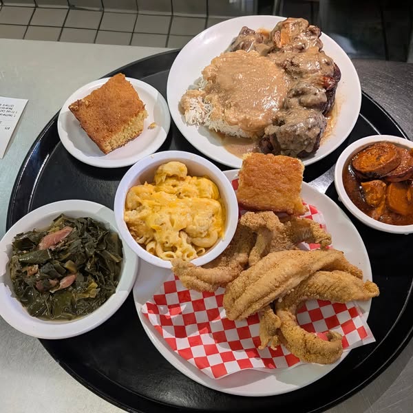 Today's special: Crispy Louisiana-Style Catfish or delicious Southern Fried Chicken. Pair it with our creamy mac and cheese, sweet candied yams, or flavorful collard greens. It’s the perfect Southern combination you’ve been craving! 🐟🧀🍠🥬