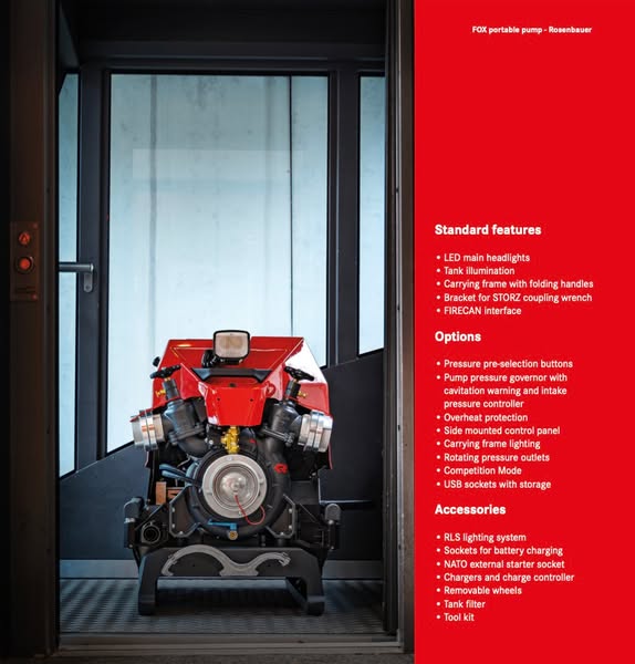 搜索关键词 wildfire protection, portable pump, Rosenbauer FOX, home fire safety, fire fighting equipment, wildfire defense, emergency preparedness, fire department equipment, high performance pump, durable pump优势 High performance (2000 liters/min at 10 bar),Compact and portable (172 kg),Durable and reliable,Versatile application,Easy to use,Trusted by fire departments