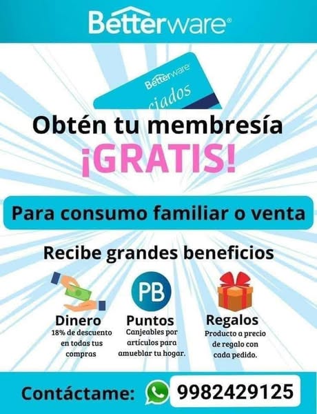 搜索关键词 Betterware affiliate, direct sales, household products, discounts and rewards, free membership, join team Betterware, home improvement products, welcome gift Betterware, Betterware Mexico, Betterware Cancun优势 Welcome gift on first order,Discounted purchases (18%),Points accumulation for rewards,Incredible products at gift prices,Free catalogs,Free affiliation,Opportunity to join without losing points