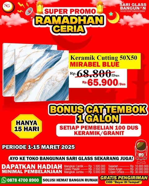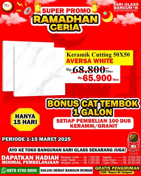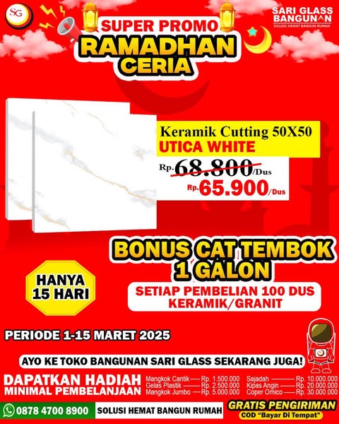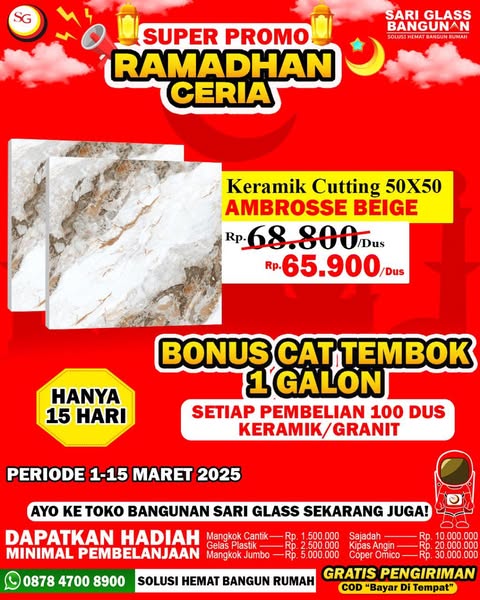 𝐒𝐔𝐏𝐄𝐑 𝐏𝐑𝐎𝐌𝐎 𝐑𝐀𝐌𝐀𝐃𝐇𝐀𝐍 𝐂𝐄𝐑𝐈𝐀. KERAMIK UNO 50x50 CUTTING ( sudut nat seperti granite ) keramik yang memiliki sudut nat seperti granite memiliki kesan elegant dan rapih untuk rumah ANDA , tanggal 1-15 MARET 2025 keramik ini sedang PROMO dari harga 68.800/dus menjadi 65.900/dus dengan STOK yang cukup TERBATAS, dan 1 galon cat BONUS untuk ANDA yang bertransaksi minimal 100 dus