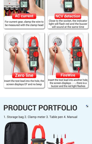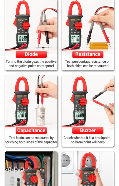 This instrument performs AC/DC voltage, AC Current, Resistance, Audible Continuity, Diode, Temperature measurements and Non-Contact ACV Detect (NCV) as well as Capacitance, Hz etc. It is an auto ranging DMM with AC current clamp meter function.