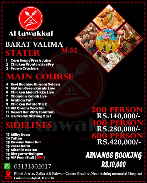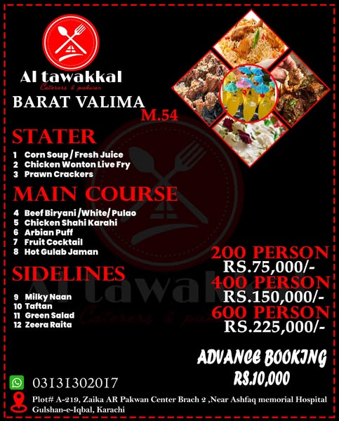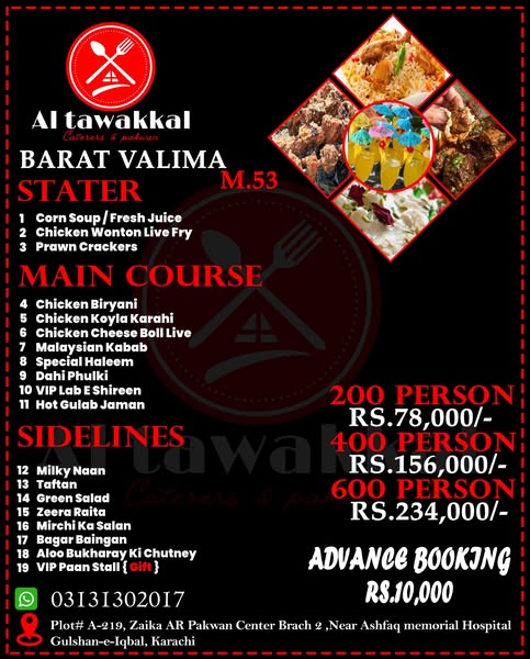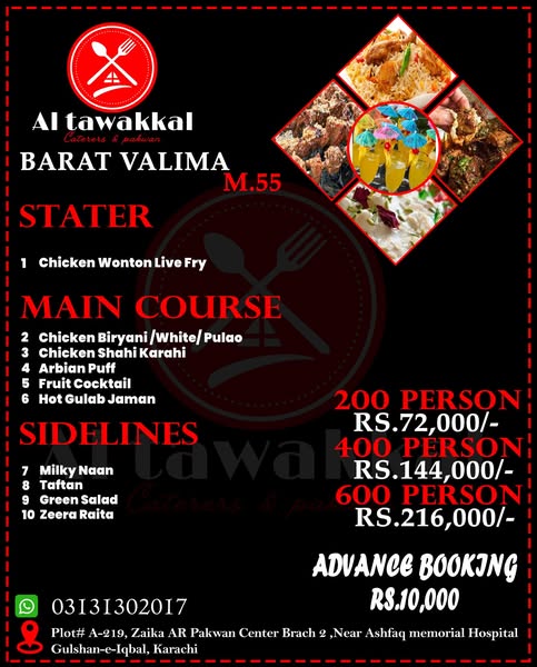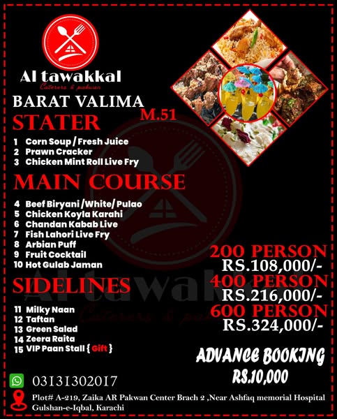 #AlTawakkal #cateringkarachi #catering #cateringservice #cateringevent #wedding #weddingfood #eventmenu #eventfood #weddingmenu #farmhouse #partyfood #cateringfood #karachi #karachiweddings #karachievents #eventcatering