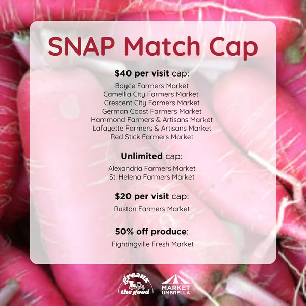 🌱 Reminder! As of January 2025, Greaux the Good has implemented a $40 match cap per visit for shoppers using SNAP at participating farmers markets, with exceptions for markets in high-need areas. This change helps us support even more Louisiana families while continuing to uplift our local farmers. 🚜