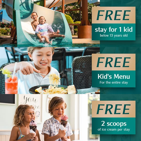 2. One Kid eats FREE unlimited during the entire stay (below 13 years old) from Kid's Menu only at Windsong Restaurant.