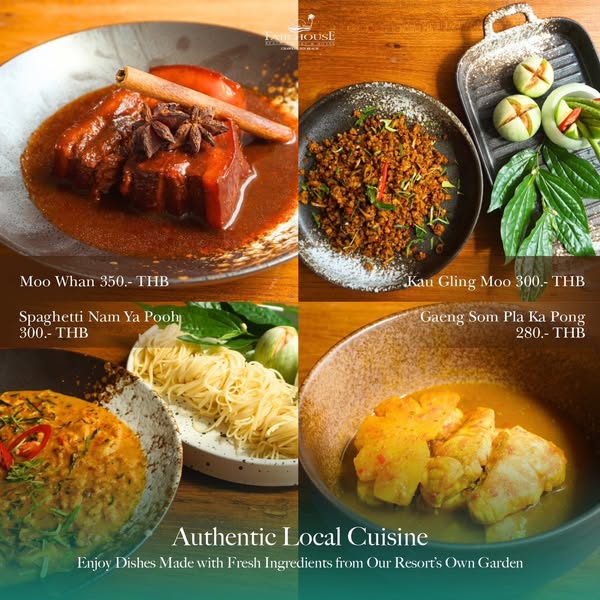 🍛 อาหารพื้นบ้านรสชาติต้นตำรับ – คัดสรรวัตถุดิบสดใหม่จากสวนของรีสอร์ทมารังสรรค์เป็นเมนูพิเศษ