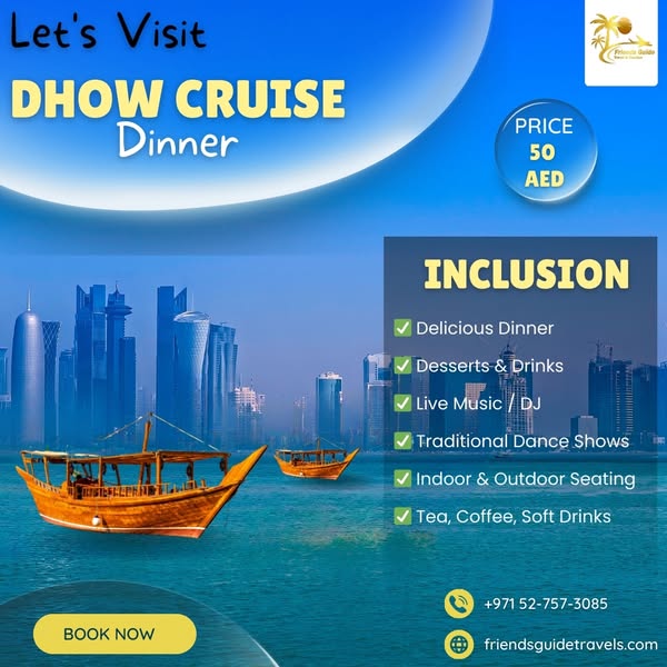 🛥 2-Hours Cruising 🍸Welcome Soft-Drinks 🍽 International Buffet Dinner 🍹 Unlimited Soft-Beverages 🎶 Entertainment shows 🎑 Beautiful Ambiance 🚻 Separate Amenities for Men & Women ⭐ Egyptian Tannora show ⭐ Horse show/Puppet Show *Route & Sightseeing:* ⭐Al seef ⭐ National Bank of Dubai ⭐ Dubai Chamber of Commerce Ruler’s Court ⭐ Dubai Museum ⭐Infinity Bridge ⭐Palm deria ⭐Hayat Regency ⭐ Sheikh Saeed house ⭐ Heritage Village ⭐ Textile Souq ⭐ pice Souq ⭐ Gold Souq ⭐Al suk Almarfa Book your tickets now and let the adventures begin! 🎢🏖️🐬🌆 Call / Whatsaap - +971 52-757-3085