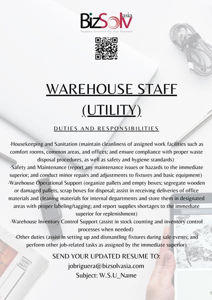 搜索关键词 Job hiring, Retail staff, Warehouse utility, E-commerce fulfillment, Logistics staff, IT developer, Sales and Marketing jobs, Quezon City jobs, Pasig City jobs, Clark Pampanga jobs优势 Variety of job positions available,Multiple locations,Clear contact information provided