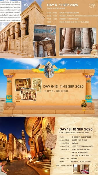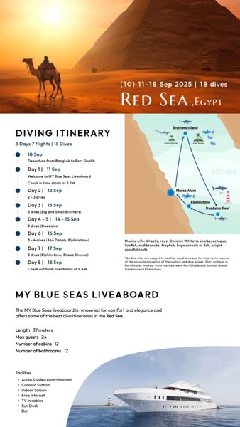 搜索关键词 Red Sea diving, liveaboard trip, Egypt travel, diving vacation, Nile River tour, scuba diving holidays, underwater adventure, Thailand promotion, travel deals, last minute dive优势 Liveaboard diving experience,Red Sea location,Includes dives and accommodation,Options for land tours (Nile River)