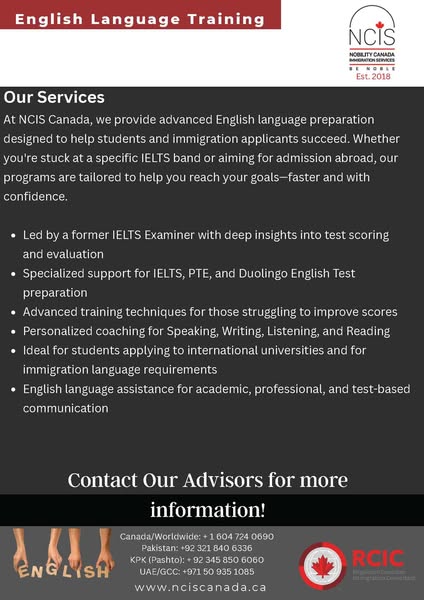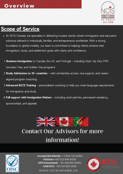 搜索关键词 Canada immigration services, study abroad Canada, IELTS language training, business immigration Canada, start-up visa Canada, student visa assistance, immigration consultants, global education pathway, NCIS Canada, immigration legal advice优势 Trusted experts since 2018,Comprehensive services: Immigration, Education, Language training,Global reach: Canada, UK, Portugal, Asia, Europe,Scholarships available,IELTS Examiner-led instruction,Honest, transparent advice