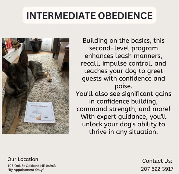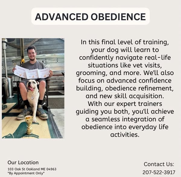 搜索关键词 dog obedience training, positive reinforcement, dog behavior, professional dog trainer, discounted dog training, oakland maine dog training, private dog training, 14 week dog training program, dog training support, transform dog behavior优势 Discounted rate for all 3 obedience programs,Positive reinforcement training methods,Professional dog trainer guidance,Ongoing support,$200 OFF