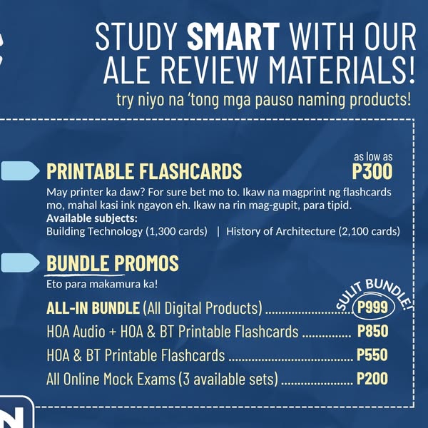 搜索关键词 ALE review, exam preparation, study materials, digital review materials, printed review materials, shopee shop, discount offer, tapnatserreview, architecture licensure exam, architecture review优势 Available in Digital and Printed formats,Discount Offer,Helps to study smart