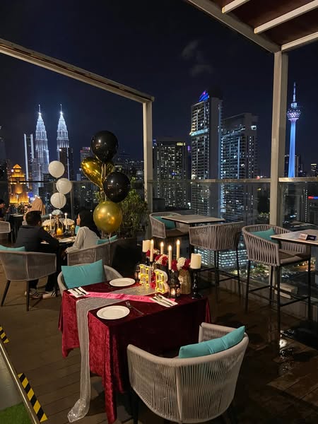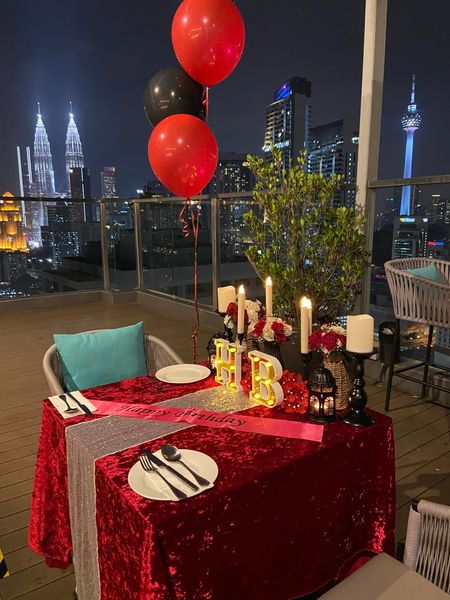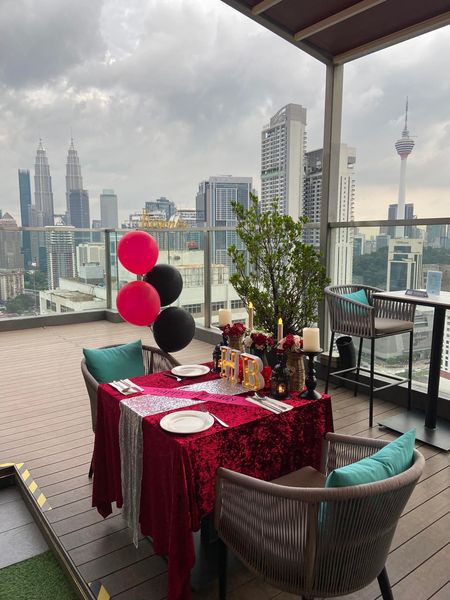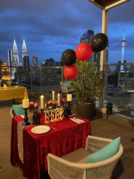 搜索关键词 romantic dinner, candle light dinner, KLCC view, KL Tower view, surprise birthday, anniversary surprise, rooftop dinner, Hilton Garden Inn, special occasion, Kuala Lumpur优势 Rooftop location with KLCC and KL Tower view,Romantic ambiance,Includes table decoration, meal set for 2, and a cake with message,Reasonable price