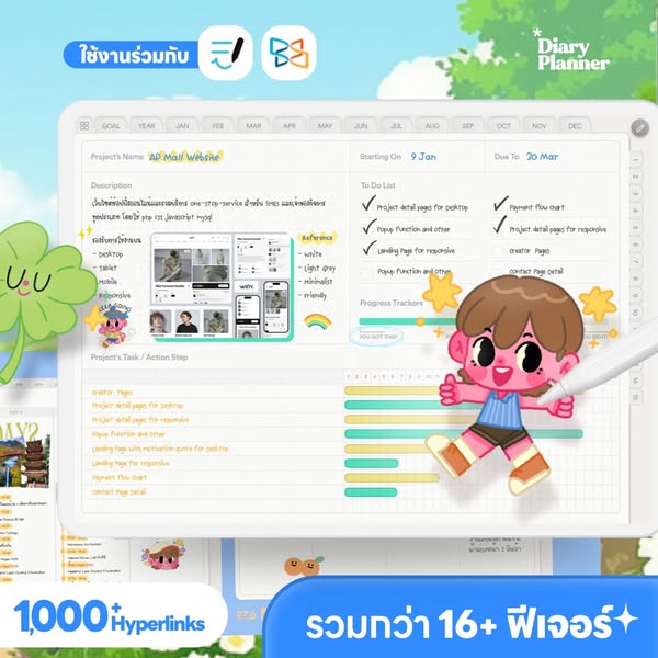 搜索关键词 digital planner 2025, diary planner, productivity planner, google calendar planner, bucket list planner, saving goals, finance planner优势 Comprehensive features for planning,Reusable every year,Affordable price (390฿ on sale),16 Productivity Features,Link with Google Calendar