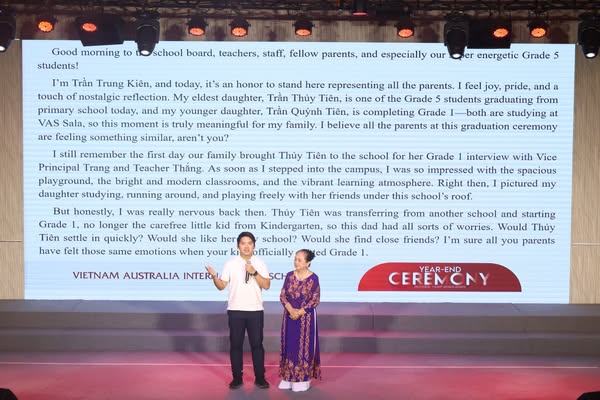 👨👩👧 Phụ huynh em Thủy Tiên, đại diện cho cha mẹ học sinh khối Tiểu học đã xúc động chia sẻ: “Từ tận đáy lòng, tôi xin cảm ơn các thầy cô đã biến VAS Sala thành ngôi nhà thứ hai cho các con chúng ta… Các thầy cô đã dìu dắt các con vượt qua thử thách, ăn mừng thành công, động viên các con qua những lần vấp ngã, và tạo ra một không gian an toàn để các con dám mơ ước và trưởng thành…”