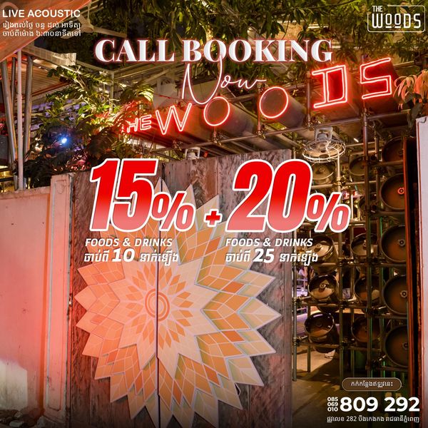 👉 បញ្ចុះតម្លៃ 15% ទៅលើម្ហូប និងភេសជ្ជៈ សម្រាប់ការ Call កក់តុចាប់ពី ១០នាក់ឡើង និង 20% ចាប់ពី ២០នាក់ឡើង (លើកលែងថ្ងៃមាន Event)