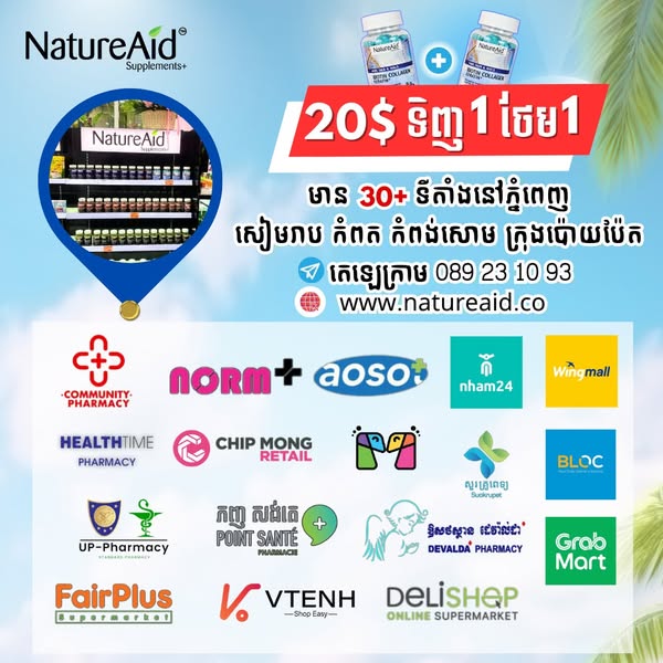 វិតាមីន NatureAid Cambodia មានលក់តាមហាងដៃគូនៅភ្នំពេញ សៀមរាប កំពត និងកំពង់សោមសរុប30+កន្លែងតាមផ្សារAeon ផ្សារChip Mong និងផ្សារMakro❗