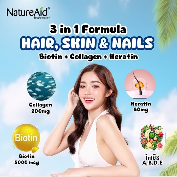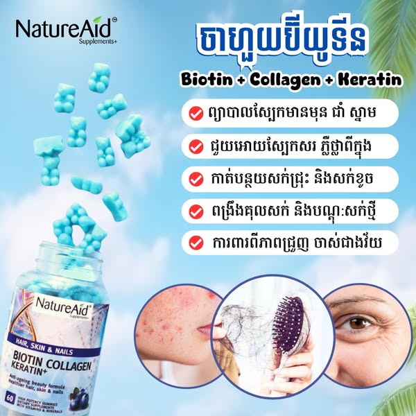 搜索关键词 Beauty Gummy, Buy One Get One, Acne Treatment, Skin Whitening, Hair Loss Prevention, NatureAid Cambodia, Vitamin B Complex, Beauty Supplement Promotion, Cosmetic promotion, healthy gummy优势 Treats acne, blemishes, and red skin,Whitens, brightens, and firms skin,Reduces hair loss and strengthens hair roots,Regenerates new skin cells,Contains Vitamin B Complex for regular menstruation,Buy 1 Get 1 Free, Buy 2 Get 2 Free
