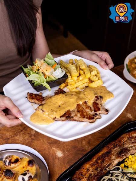 这款斧头骨猪排可是全芙蓉首创的独家美味!老板亲自挑选切割的斧头骨猪排,保留了骨头的部分,软嫩中略带嚼劲的肉质在铁板滋滋不断地烤制中完美地锁住了汁水,每一口都肉香四溢~再搭配意大利面和清爽沙拉,真的好满足!