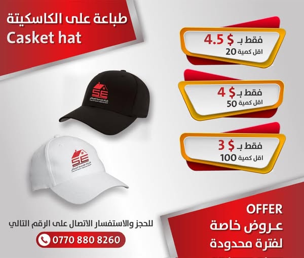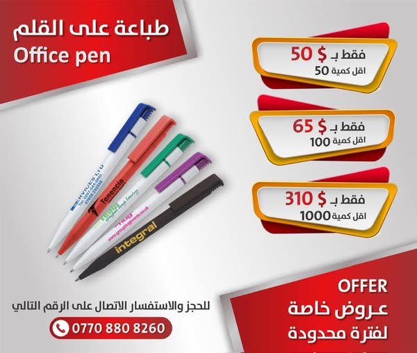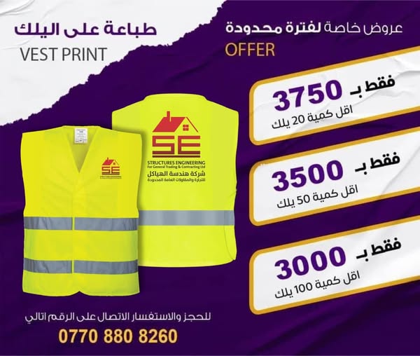 搜索关键词 printing services Iraq, promotional items Iraq, safety vests printing, custom mugs printing, wholesale printing Iraq, branded merchandise Iraq, Iraq advertising solutions, corporate gifts Iraq, fast printing Iraq, reliable printing services优势 High-quality printing,Timely delivery,Wide range of products (vests, helmets, t-shirts, mugs, pens, notebooks, bracelets, balloons),Warranty on mugs and pens,Delivery available to all Iraqi governorates