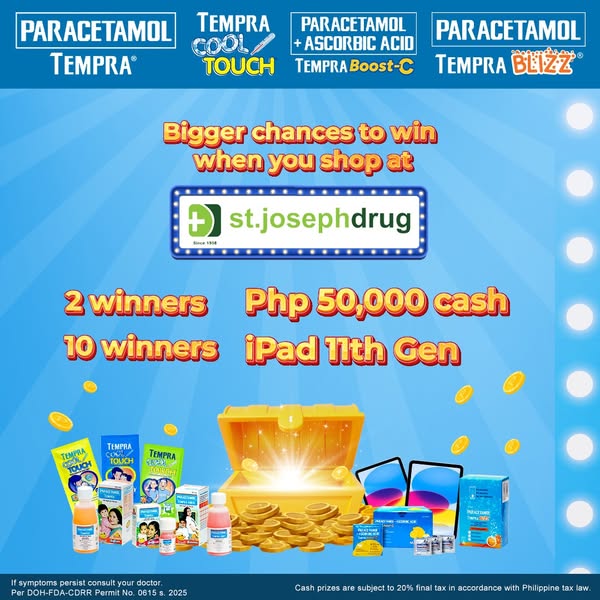 Buy your trusted Tempra products at St. Joseph Drug and get a chance to WIN from over ₱4 MILLION worth of prizes! 💸