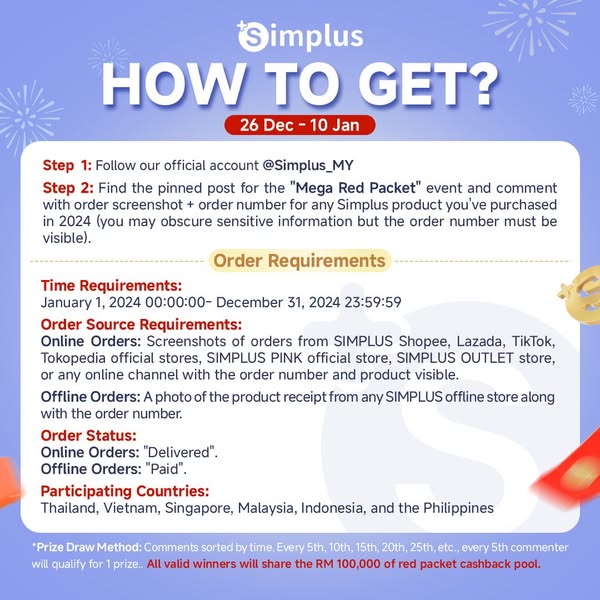 搜索关键词 Simplus new year, cashback reward, home appliances giveaway, lunar new year, AngPao event, Malaysia online shopping, Simplus MY, red packet campaign, online order cashback, appliance promotion优势 Cashback Rewards,Multiple Participating Countries,Easy Participation