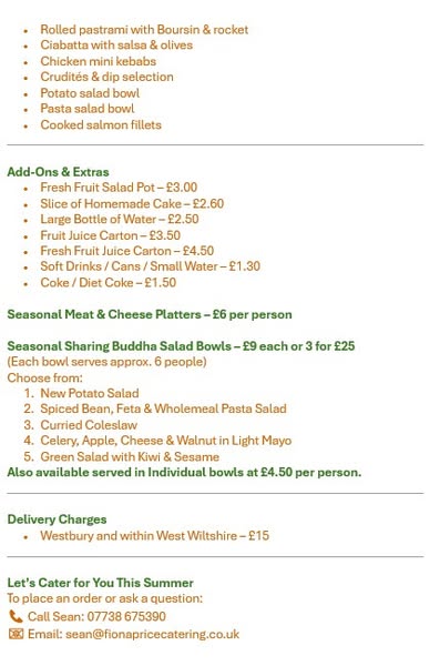 搜索关键词 Summer buffet catering, Wiltshire catering, Event catering services, Fiona Price Catering, Party food catering, Office lunch buffet, Seasonal food catering, Sustainable catering options, Catering for dietaries, Buffet menu options优势 Fresh seasonal flavors,Homemade & beautifully presented,Dietary requirements catered for,Sustainable packaging,Variety of menus for different budgets