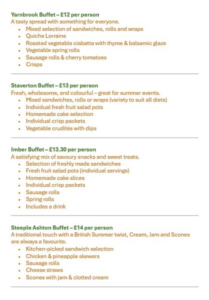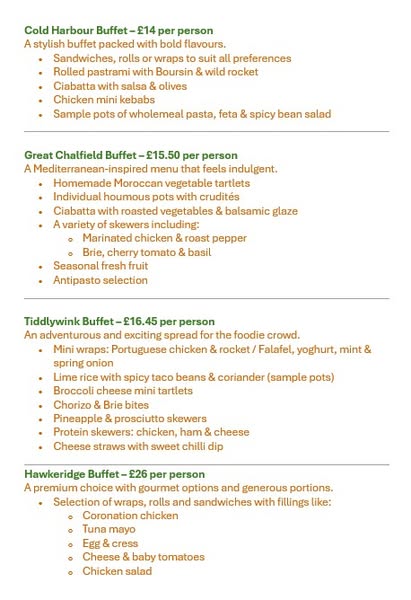 From the light and tasty Rudge Buffet at just £7.50pp to the indulgent and adventurous Tiddlywink or Hawkeridge spreads, there's something to suit every occasion, appetite, and budget.
