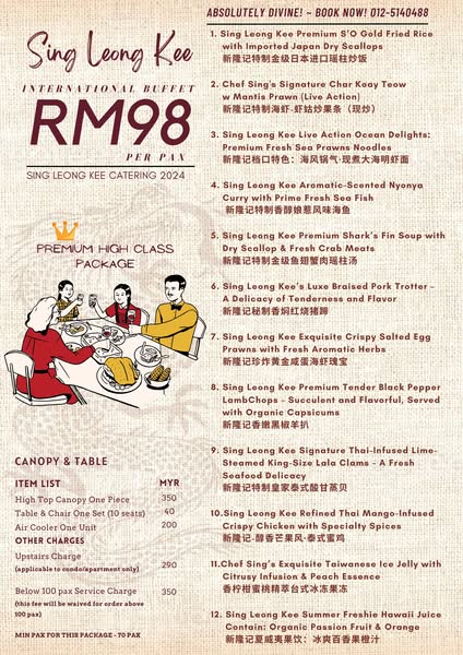 搜索关键词 penang catering, buffet menu, wedding catering, birthday party, house celebration, company event, annual dinner, 2025 menu, sing leong kee优势 New 2025 buffet menu,Suitable for weddings, birthdays, and housewarming events,Packages available for big company events/annual buffet dinners