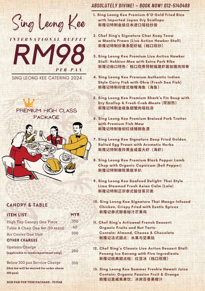 搜索关键词 penang catering services, wedding buffet penang, birthday party catering, new house celebration, company event catering, annual buffet dinner, Sing Leong Kee catering, 2025 buffet menu, buffet menu packages, affordable buffet penang优势 New buffet menu for 2025,Suitable for weddings, birthday parties, and housewarming celebrations,Packages available for company events