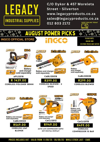 搜索关键词 Legacy Industrial Supplies, Ingco Wadfow tools, August tool deals, Power Pick Specials, unbeatable deals, tool promotion, industrial tool sale, tool discounts, VAT included price, limited stock优势 Unbeatable deals,Top-quality products,VAT included in price