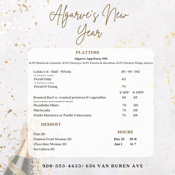 📍 Visit us at 656 Van Buren Ave or call 908-353-4433 to place your orders today! Let Algarve make your New Year’s celebration truly special! 🎊