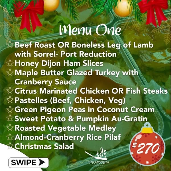 搜索关键词 Christmas catering service, Trinidad catering, Holiday catering, Festive catering menu, Christmas dinner catering, Private chef Trinidad, Trinidad Christmas food, Catered Christmas celebration, Delicious Christmas roasts, Christmas party catering优势 Festive Flavors,Delicious Roasts & Desserts,Convenient Catering,Individual Packaging or Buffet Style
