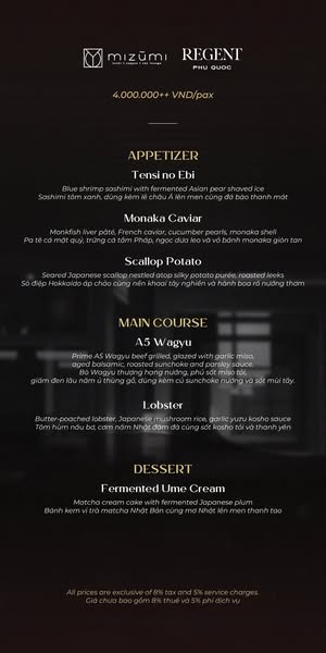 🌟 Một lần nữa, ngọn lửa đam mê được thắp lên tại Mizumi Westlake với Chef Andy Huỳnh đến từ Regent Phu Quoc tái ngộ cùng Chef Hảo Phạm – Bếp trưởng Mizumi – trong một đêm tiệc thăng hoa giữa ẩm thực đương đại và nghệ thuật thưởng thức sake Nhật Bản.