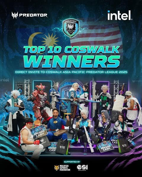 🕺 Coswalk大赛:参赛者们将有机会在大赛舞台上展示创意和造型!RM25,000 的奖金池等你来争夺 🎉。冠军将获得一台 Predator 游戏笔记本和现金奖励!