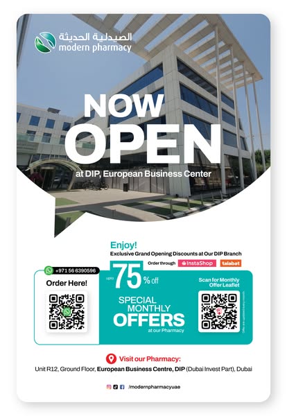 #ModernPharmacyDIP #GrandOpening #OpeningApril28 #DIPPharmacy #PharmacyDeals #75Off #TalabatUAE #InstaShop #UAEPharmacy #HealthAndWellness #WellnessDelivered #PharmacyNearMe #NewInDIP
