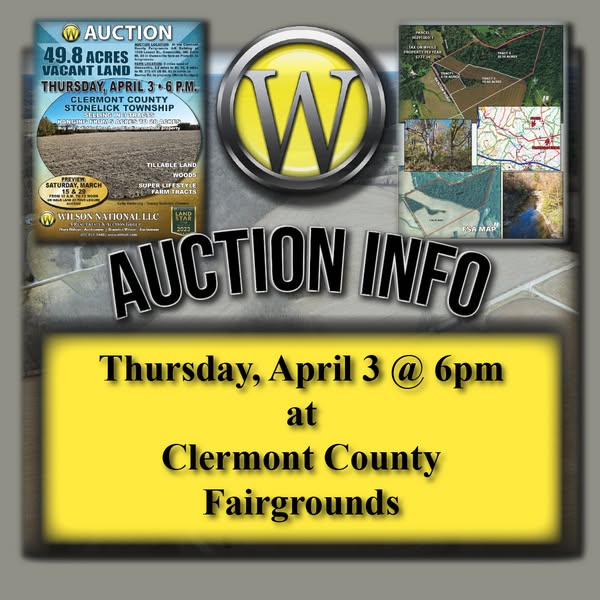 搜索关键词 land auction, real estate investment, ohio real estate, agricultural land, vacant land clermont county, wilson national auction, land for sale, farm tracts, acreage for sale, owensville ohio land优势 Versatile property with tillable land and wooded acreage,Multiple tracts available, allowing for flexible purchasing options,Located near Stonelick Hills Golf Club and Owensville, OH