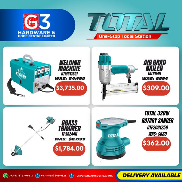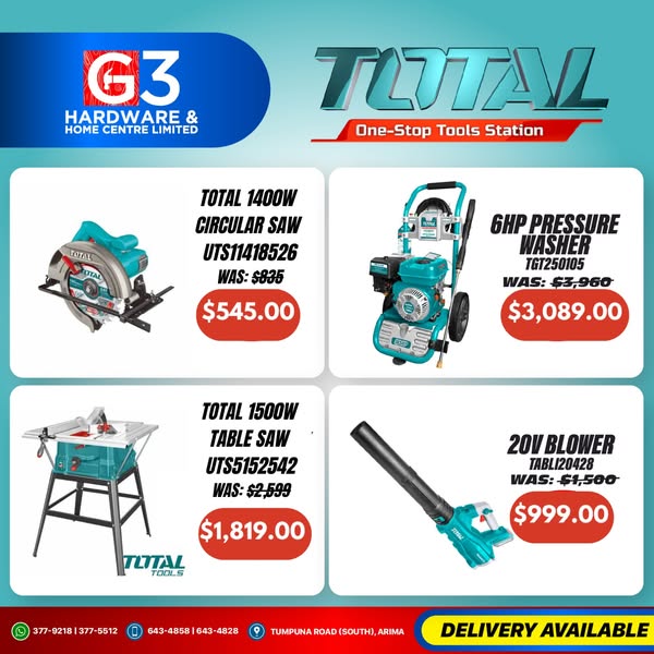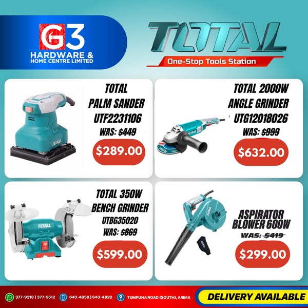 #G3Hardware #TotalToolsTT #ToolsOnSale #TrinidadHardware #PowerTools #ContractorEssentials #ToolDeals #WorkSmarterNotHarder #DIYTrinidad #TumpunaRoadDeals #HardwareSolutions #G3TotalTools #TotalToolSavings #ToolTalkTT