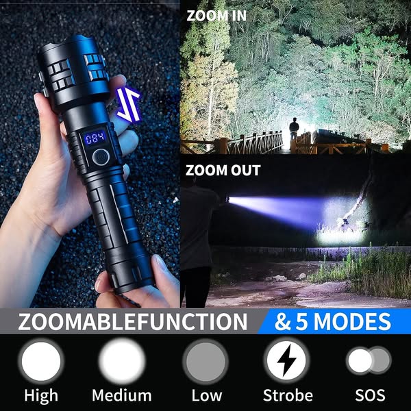 - Đèn pin có độ sáng cao với các hạt đèn LED XHP99 nâng cấp, Đèn pin sạc này có thể tạo ra công suất siêu cao lên tới 990.000 lumen, độ sáng có độ sáng cao của đèn pin sáng hơn khoảng 10 lần so với P50 và P70 thông thường, dễ dàng chiếu sáng 2000 mét vuông, có thể chiếu sáng một vật thể cách xa tới 1000 mét.