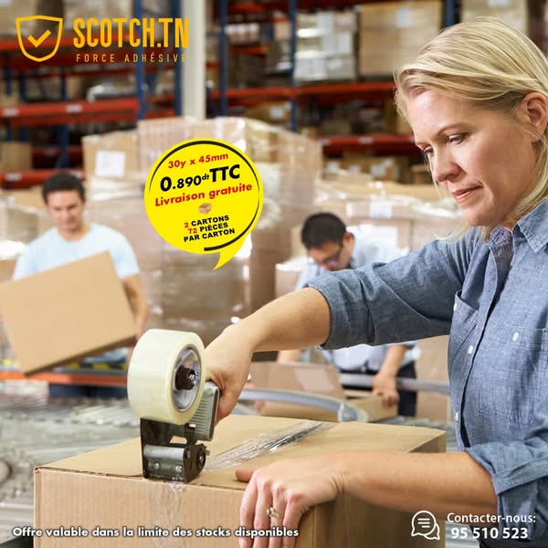 🎁 Offre spéciale! Scotch transparent, dimension 30y*45mm, seulement 0.890 DT TTC! 📦 Achetez 2 cartons ou plus et bénéficiez de la livraison gratuite. Appelez au ☎️ 95510523 pour en profiter!