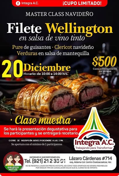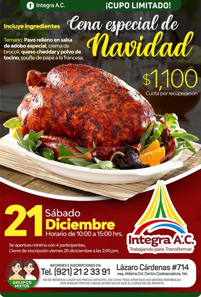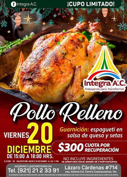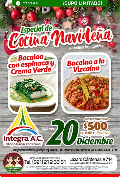 搜索关键词 Coctelería navideña, Cursos de cocina, Alimentos para navidad, Aprender a cocinar, Cocktail course, Christmas food course, Cursos Coatzacoalcos, Food and beverage training, Limited spots available, Professional cooking course优势 Cursos mixtos,Instructores capacitados y con experiencia,Temática navideña atractiva